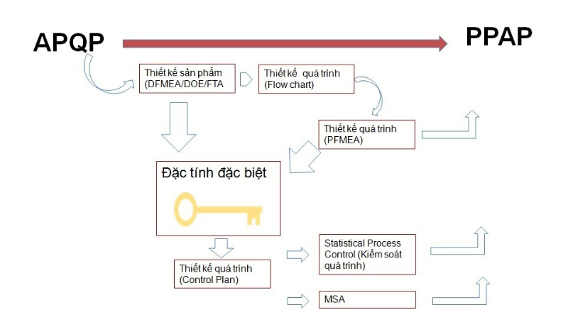 Như vậy, công cụ được sử dụng đầu tiên sẽ là APQP, kế tiếp là thiết kế sản phẩm, thiết kế quá trình (FMEA), sau đó đến SPC, MSA và cuối cùng là bộ hồ sơ PPAP.