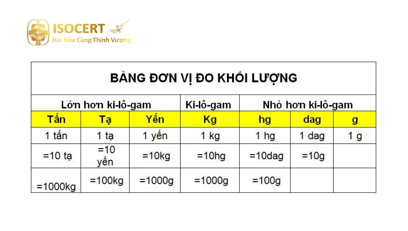 Như đã nói ở trên, tùy thuộc vào độ lớn khối lượng của một vật mà chúng ta sẽ sử dụng tương ứng các đơn vị đo khối lượng cho phù hợp. Dưới đây là bảng đơn vị đo khối lượng chính xác mà các bạn có thể tham khảo: