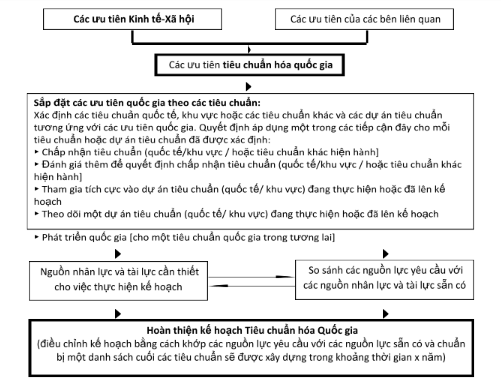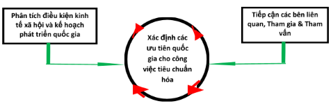 Hình dưới đây mô tả quá trình xác định các ưu tiên cho công việc tiêu chuẩn hóa là một quá trình lặp đi lặp lại trong đó các kết quả từ phân tích kinh tế - xã hội, phân tích kế hoạch phát triển quốc gia của các cơ quan khác nhau và đầu vào từ các bên liên quan được đối chiếu với nhau nhằm đưa ra quyết định về những lĩnh vực và chủ đề nào cần được giải quyết như là ưu tiên trong công việc tiêu chuẩn hóa trong tương lai.
