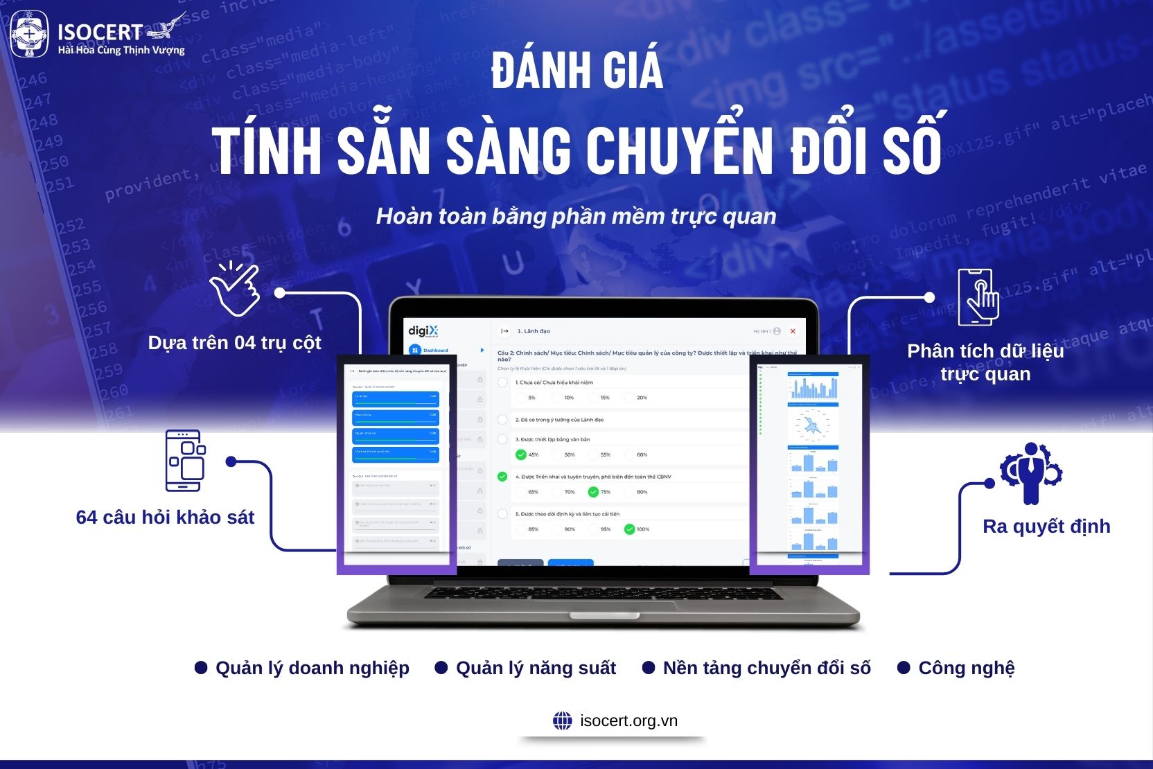Trước tiên, doanh nghiệp cần đánh giá thực trạng doanh nghiệp đang nằm ở cấp độ nào để có quyết định và lộ trình thực hiện phù hợp. ISOCERT cung cấp giải pháp phần mềm đánh giá tính sẵn sàng chuyển đổi số của doanh nghiệp (04 trụ cột, 64 câu hỏi) để doanh nghiệp có thể ra quyết định đúng đắn khi bắt đầu bước vào hành trình chuyển đổi số toàn diện.