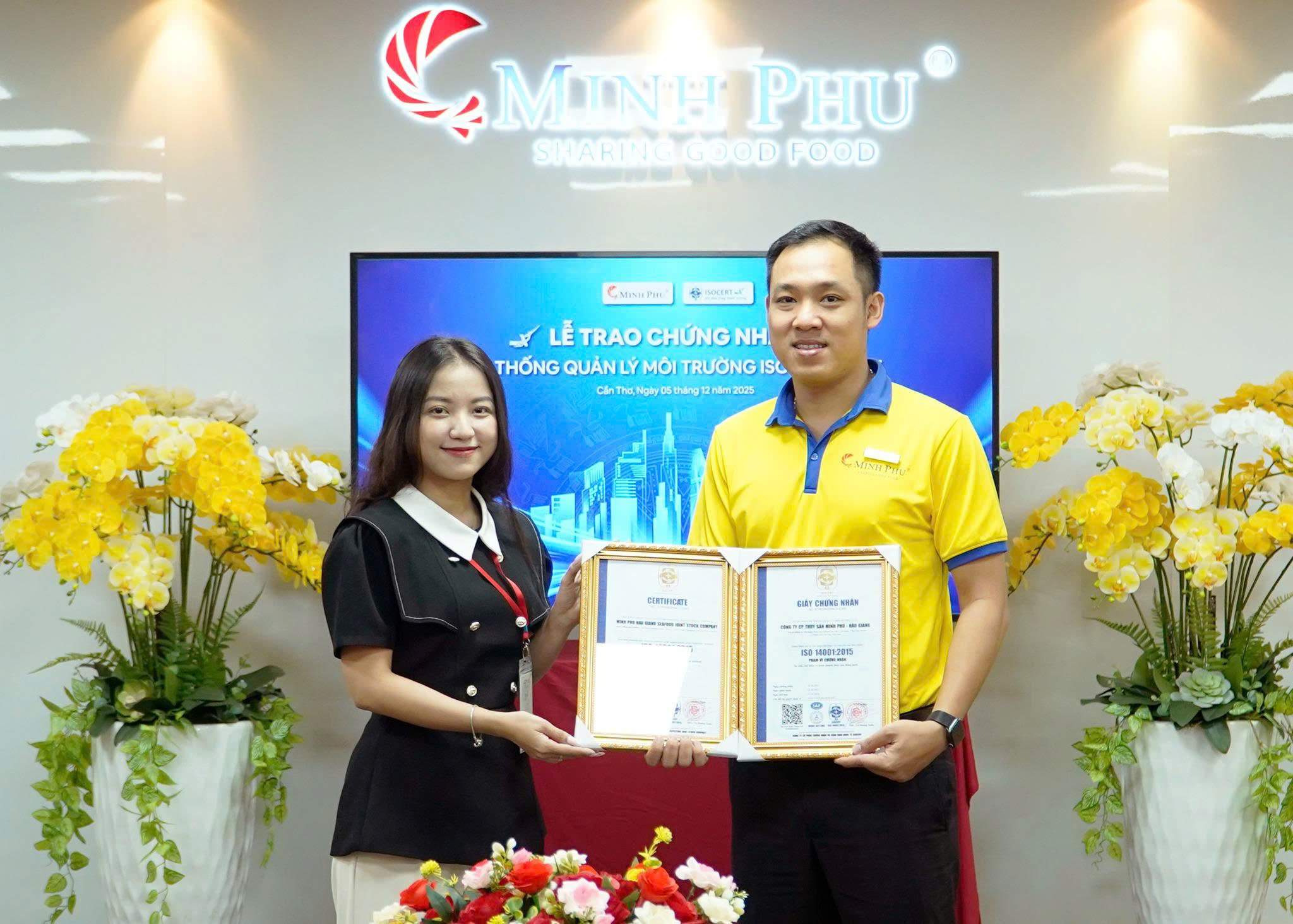 Đại diện công ty Cổ phần Chứng nhận và Giám định quốc tế ISOCERT trao giấy chứng nhận ISO 14001:2015 cho đại diện công ty Cổ phần Thủy sản Minh Phú - Hậu Giang