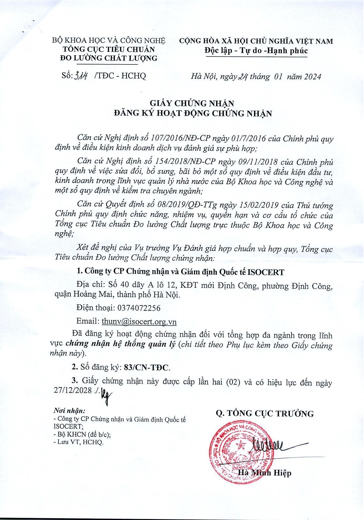Ngày 28/12/2023 và ngày 24/01/2024, Căn cứ Quyết định số 08/2019/QĐ - TTg, ISOCERT đã được Tổng Cục Tiêu Chuẩn Đo Lường Chất Lượng Thuộc Bộ Khoa Học Và Công Nghệ công nhận Chúng tôi đủ năng lực duy trì đánh giá và chứng nhận “Hệ thống quản lý TCVN ISO 9001/ ISO 9001 đối với tổng hợp đa ngành” và “chứng nhận đối với tổng hợp đa ngành trong lĩnh vực chứng nhận hệ thống quản lý” (Chi tiết giấy chứng nhận theo Phục lục dưới đây)