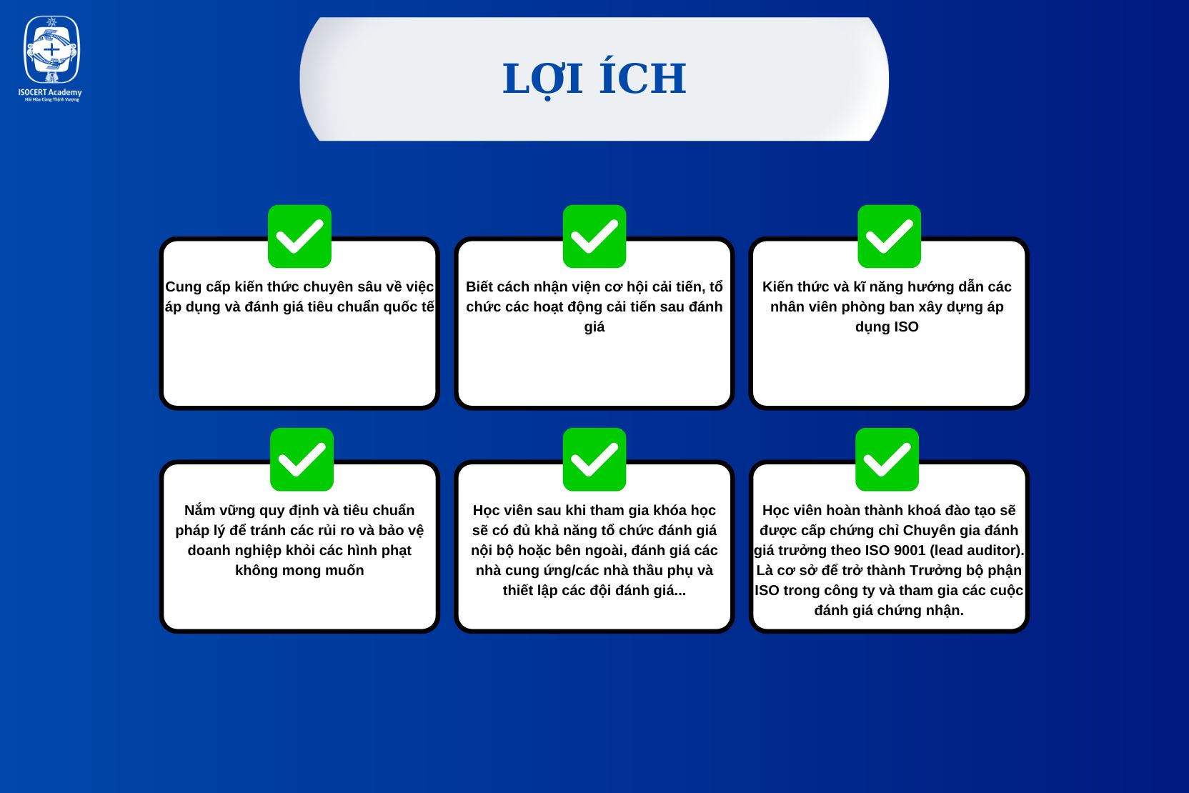 6. Học viên hoàn thành khoá đào tạo sẽ được cấp chứng chỉ Chuyên gia đánh giá trưởng theo ISO 9001 (lead auditor). Là cơ sở để trở thành Trưởng bộ phận ISO trong công ty và tham gia các cuộc đánh giá chứng nhận.