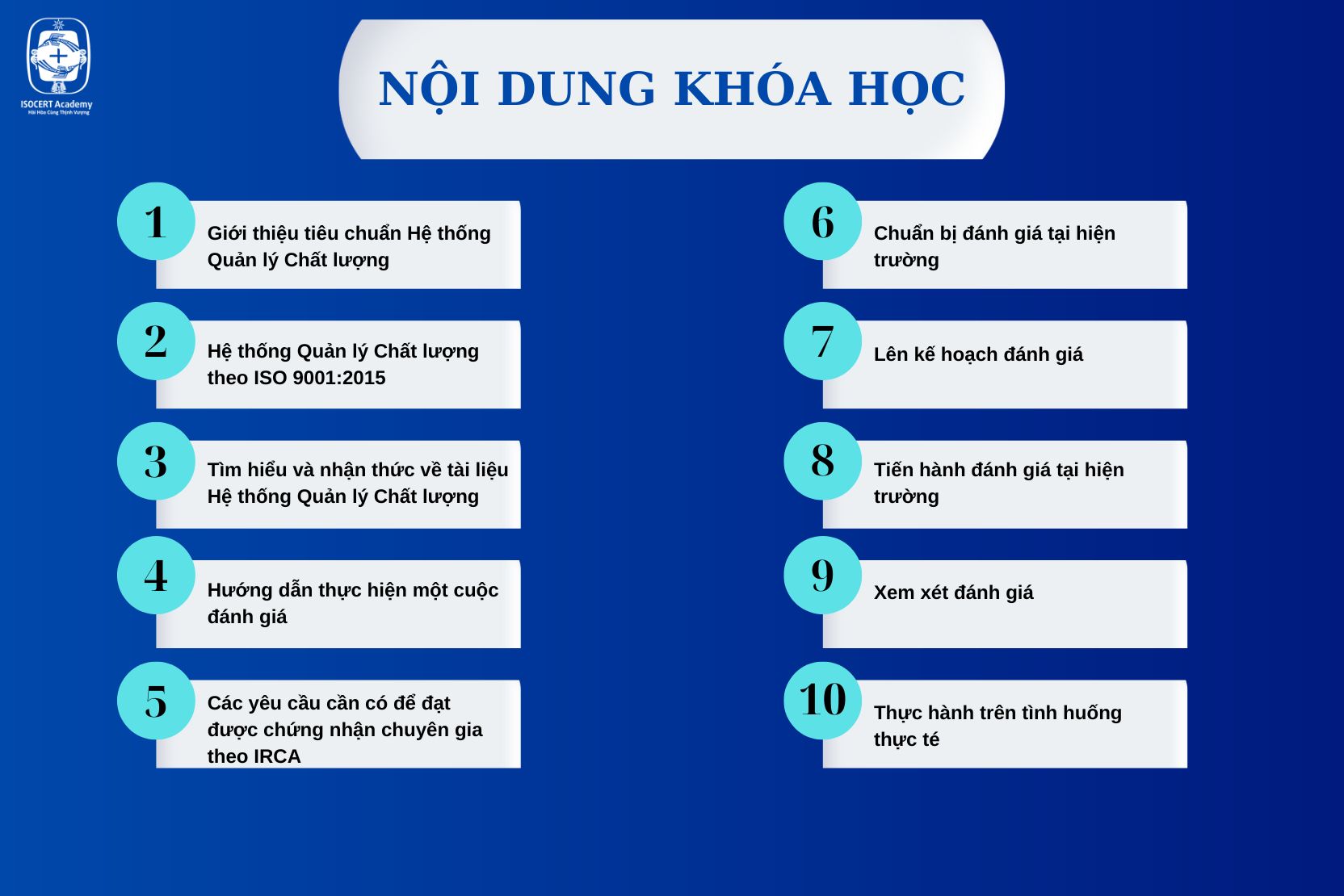 Khóa học đào tạo Chuyên gia đánh giá trưởng HTQL Chất lượng ISO 9001:2015/ISO 9001:2015 của ISOCERT sẽ cung cấp những kiến thức quan trọng, cần thiết cho bạn với các nội dung: